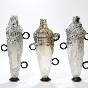 After studying graphic design at the Central School of Art & Design in London and further training in glass kiln forming, glass fusing and glass blowing techniques in the USA and England, Cathryn Shilling set up her studio in 2009. Cathryn has always pushed the technical constraints of her material. She is known for her innovative approach in articulating her visual language through movement and colour. The result are one-off sculptural creations which capture a visual dialogue akin to characters on a stage.